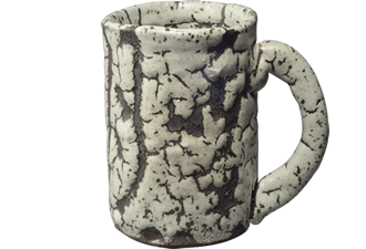 人間国宝・石黒宗麿に師事し、鉄釉陶器を学んだ清水卯一(1926-2004)は、自ら土や釉材を探し、採取するなど、基本の陶土、釉薬に並々ならぬこだわりを持っていました。そして天目釉、柿釉など多様な釉技に才腕を示して世界的な評価を獲得。85年には人間国宝にも認定されます。黒い鉄釉に白い釉薬をほどこした晩年のスタイルは、このビヤマグにも反映され、その名の通り白雪で覆われたような静けさが魅力的です。