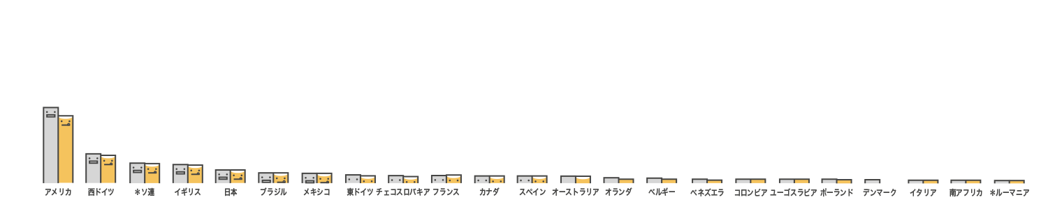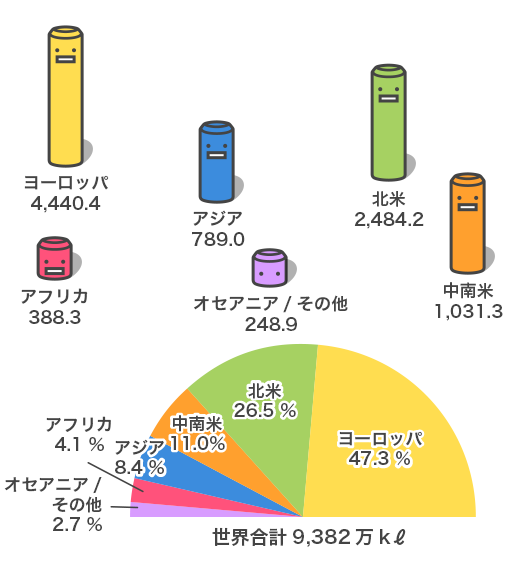 昨年(1980年)1年間に世界で生産されたビールは前年に比較して3.1%増え、約9,382万kl(約1,482億本)となった。この生産量は、東京霞ケ関ビルをジョッキに見たてて計ると、179.2杯分(前年比5.4杯分増)に相当し、大びんに入れ立てて並べると、地球と月の間を14往復半する長さになる。また、世界の1人当りや費量は前年に比較して0.4本増加し、34.5本となった。
