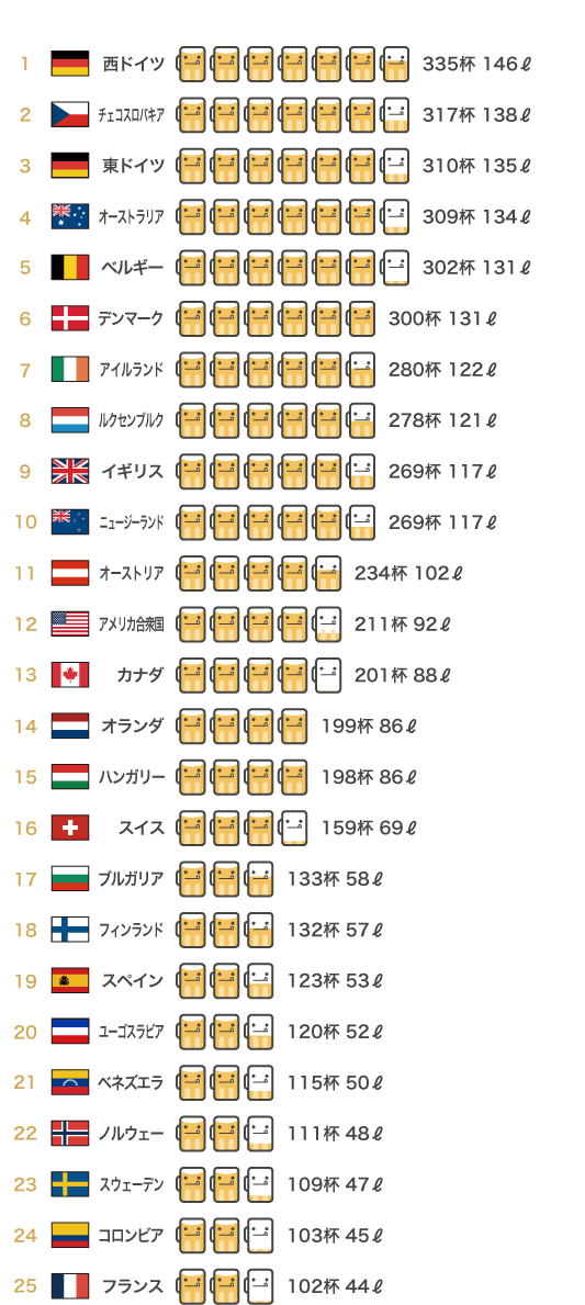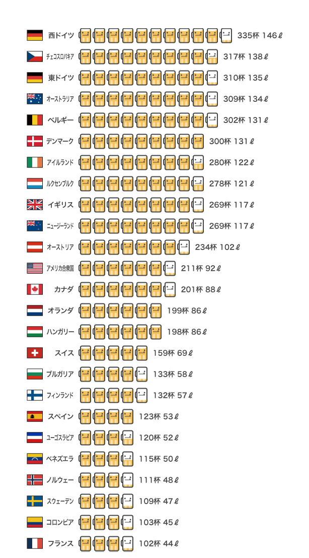 1人当たり消費量の最も多いのはビールの本場といわれる西ドイツで335杯と、前年比1杯増加し、2年続きの減少傾向に歯止めをかけた。次いで、チェコスロバキア317杯、東ドイツ310杯、オーストラリア309杯、ベルギー302杯、デンマーク300杯と300杯以上の国は6カ国となっており、特にベルギーは前年に比べ12杯増加し300杯を超えた。