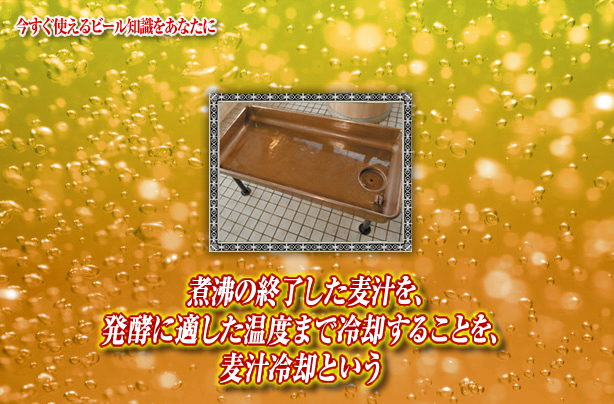 ビールの歴史 煮沸の終了した麦汁を、発酵に適した温度まで冷却することを、麦汁冷却という 煮沸の終了した麦汁は、発酵に適した温度まで冷却される。現代のビール造りでは熱交換器で短時間に冷却されるが、以前は、自然冷却だった。