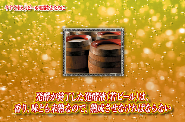 発酵が終了した発酵液(若ビール)は、香り、味とも未熟。未熟な香味の原因物質を減少させるために行われるのが熟成で、その工程を「貯蔵(lager)」と呼ぶ。低温で長い熟成期間が必要な下面発酵ビールがラガービールと呼ばれるのはこのことから。