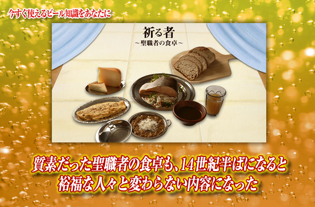 祈りを軸として瞑想や労働を行う修道院の食事は、元来は肉食が遠ざけられ、魚や卵、野菜が中心の質素なもの。年200日の断食期間は1日1食だったという。ところが14世紀半ば近くになると、肉類だけでなく、ビールやワインも豊かに支給されるようになる。なんと1日6000キロカロリーに及ぶことさえあった!