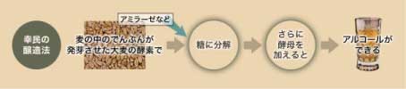酵母が糖を中心としたエキス分を分解するとき、 炭酸ガスなどとともにアルコールが生成される。ビールの場合、まず原料の麦に含まれるでんぷんが、麦芽の酵素によって糖に分解される(糖化)。ここに酵母を添加すると、酵母の生命活動によってアルコールができるのだが、幸民は、この糖化について非常によく理解していたようだ。また、彼は麦汁を得るときに酵素が最もよく働く温度についても記している。『化学新書』の一節(訳文)をみてみよう。