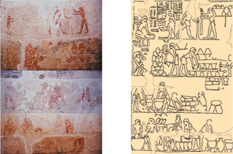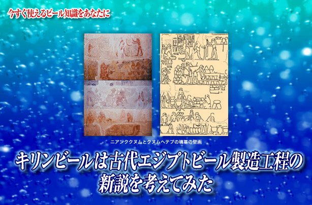 ビールの歴史 キリンビールは古代エジプトビール製造工程の新説を考えてみた みずから提唱した新たな仮説に基づいて、キリンビールでは2002年、古王国時代のビールづくりの再現に着手した。その製造工程は上図の通り。5000年前にこれほど複雑な工程でビールを製造していた古代エジプト人の知恵に感心させられる。 古王国ビール製造方法の仮説と検証のもとになった壁画はこちら。 ニアンククヌムとクヌムヘテプの墳墓の壁画