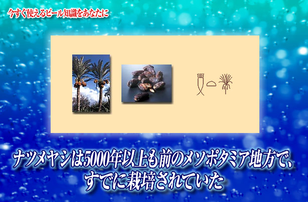 ナツメヤシはデーツとも呼ばれる。いまから5000年前にはすでにメソポタミア地方で栽培が始まっていた。直径2センチほどたまご型の実は非常に甘く、干して食べたりジュースにしたり、ジャムやシロップに加工され、ジュースを発酵させるとアルコール飲料になる。キリンビールが2002年に行った古王国ビール再現実験では時期的に生のナツメヤシが入手できなかったため、干したナツメヤシを使用した。