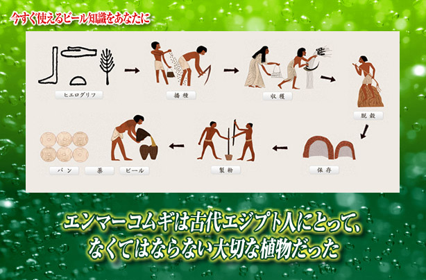 古王国、新王国時代を通じて、ビールの主な原材料となった。いまもビール醸造に使った容器には、大麦とならんでエンマーコムギの粕が見つかっている。