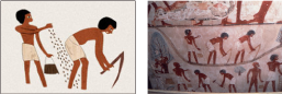 古代エジプトでは毎年夏、ナイル川が氾濫した。洪水が引くと土を耕し種を巻く。穀物を管理する役人が革袋や籠に麦を入れ、畑に播く様が見られる。この後ヒツジを畑に入れ、その蹄で種を地中に埋めた。