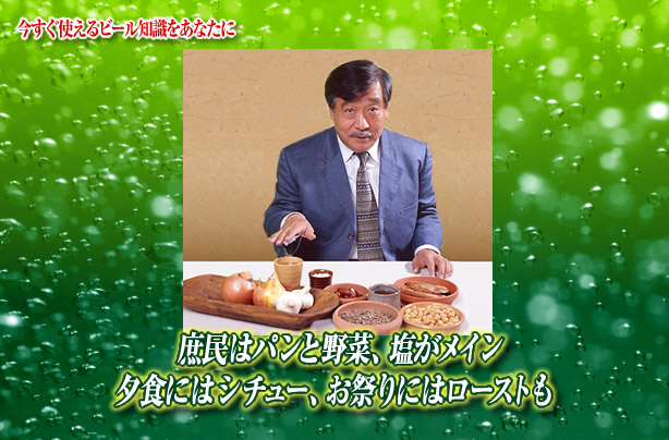 古代エジプトでの庶民というと、おおむねが農民であった。農民は朝、夜明けとともに起き、畑に出かけ、陽が沈む頃家に帰るという1日を送っていたので、食卓を囲んで一家だんらんということは1年のうち何日かのお祭りのときしかなかった。毎日パンと野菜、そして塩を水で流し込む食生活を送っていたが、夕食に関しては、干肉などを野菜と水煮したシチューの元祖のようなものを食べていた。そしてお祭りのときは牛や羊のローストを貴族からふるまわれ、一年の疲れをいやしていた。