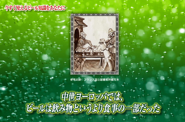 北方ゲルマン民族の飲み物だったビールが、中世になるとヨーロッパ社会で広く受け入れられるようになった。この頃のビールは栄養を取るための食事でもあり、今と比べるとかなり多量に摂取されていたらしい。結婚式やキリスト教の祝日には、ビールで歓談する宴会も開かれたという。この頃から宴会といえばビールだったのだ。