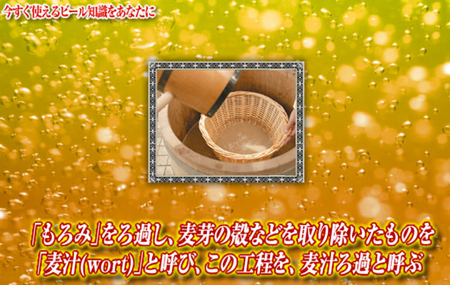 製麦工程でできた麦芽を仕込釜に入れて、湯を加えて、さらにホップを加えてできた汁。最初に流れ出てくる麦汁を「一番搾り麦汁」といい、殻からしみ出す渋味成分が少ないので、できあがったビールにさっぱりとした味わいとストレートなのどごしをもたらすことができます。さらにもろみに残っている糖分を得るため湯を加えろ過した麦汁を「二番搾り麦汁」といいます。