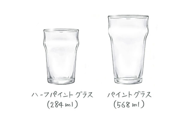 チビチビと味わいながら香りを楽しむエールに最適なグラス。容量は英国で568ml、米国で473ml。グラス上部にのニックという特徴的な膨らみがあります。これはグラスに指がかかりやすいように配慮されたもので、この膨らみのおかげで香りがグラス内に滞留し、最後まで香りを残す効果もあります。香り高いビールや芳醇でコクのあるビールに最適です。パイントグラスは大きめのグラスですが、そのちょうど半分量のハーフパイントグラスがあります。