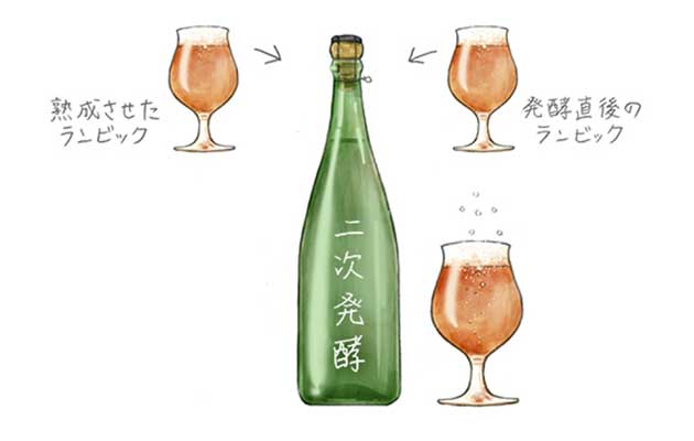 2〜3年、樽で熟成させたランビックと、熟成が1年ほどの若いランビックを、ブレンドして作ったビール。心地よい酸味があり、炭酸もビールというよりシャンパンに近い。テイスティングで「馬小屋」「倉庫」などと表現される個性的な香り。びんに詰めてからもさらに長期間熟成させますが、その間にびんの中で二次発酵が行われ、最初のランビックとはまったく違ったビールができあがります。ブレンドされた若いランビックに糖が残っており、びんのなかで活発な二次発酵が進むため、シャンパンボトルに詰められてコルクで栓をされるのが一般的です。コルクを抜くと、まるでシャンパンのようにグラスの中で発泡し続けます。麦で作ったスパークリングワインともいわれます。