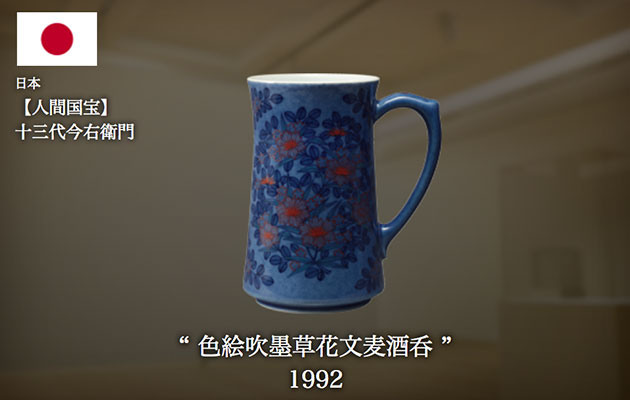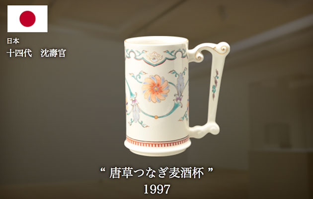 十三代今右衛門(1926-2001)。このマグで使われている「吹墨」の技法は、十三代今右衛門が再び現代に蘇らせた今右衛門窯の代表的な技法です。今右衛門家は、江戸期に鍋島藩(現・佐賀県)の御用赤絵師となって以来、代々「色鍋島」の制作を続けてきました。