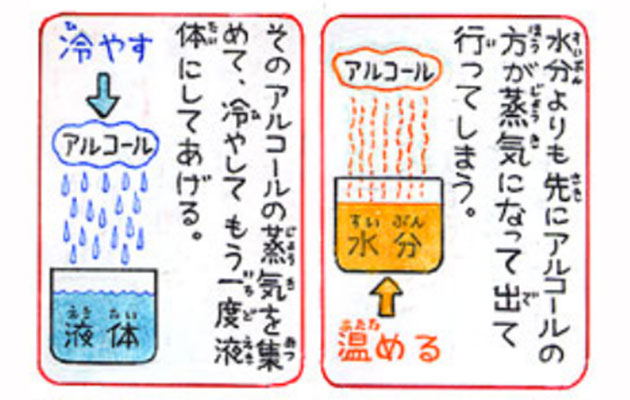 醸造酒を熱してできた蒸気を冷やして液体として回収したお酒。純粋アルコールが沸騰する温度は約78℃。水分よりも先にアルコールの方が蒸気になり、そのアルコールの蒸気を集め、冷やして液体にすると、もとのお酒よりもアルコール濃度の高いお酒が作られます。できあがったばかりの蒸留酒は無色透明ですが、タルに詰めて熟成させると琥珀色に変わります。またタルのなかで少しずつ蒸発するため中身は減り、アルコール度数も下がっていきます。