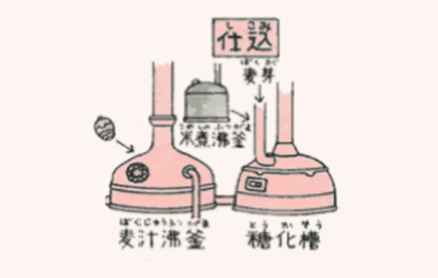麦芽の中に含まれる酵素アミラーゼによってでんぷん質が糖分に変わること。細かく砕いた麦芽に湯を入れ、釜で煮た米を加え、糖化釜に移しかえながら温度を上げることで、麦芽の酵素の働きで、でんぷん質は糖分に変わります。糖化の工程でつくられるものが麦汁です。