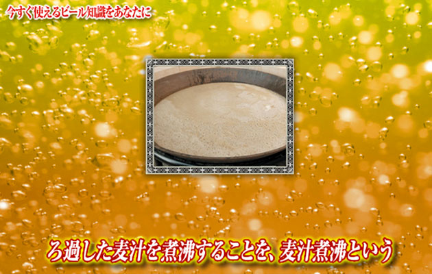 ろ過した麦汁を煮沸すること。麦汁を煮沸することで、麦汁の殺菌、ビールの混濁の原因となるタンパク質の熱凝固による除去、色度の上昇、不快な臭いの除去などがおこなえます。また、煮沸時に、ハーブ類を加えると、その香味が麦汁に移ります。現代のビールづくりでは、ホップがこの段階で加えられています。