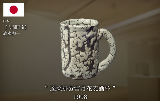 1926-2004。人間国宝・石黒宗麿に師事し、鉄釉陶器を学ぶ。自ら土や釉材を探し、採取するなど、基本の陶土、釉薬に並々ならぬこだわりを持ち、天目釉、柿釉など多様な釉技に才腕を示して世界的な評価を獲得。85年には人間国宝に認定されます。黒い鉄釉に白い釉薬をほどこした晩年のスタイルは、このビヤマグにも反映され、その名の通り白雪で覆われたような静けさが魅力的です。