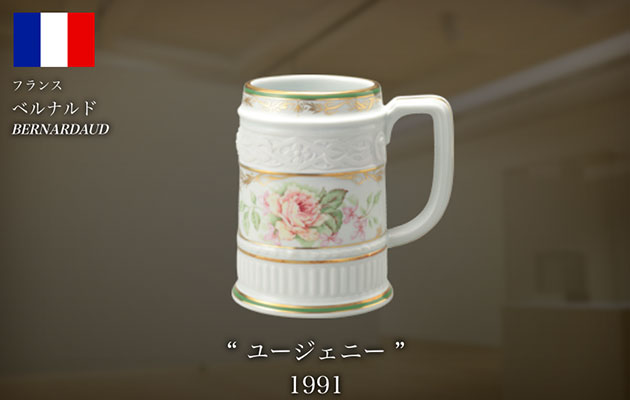 セーブルと並ぶ磁器の名産地、フランス中部のリモージュの町で1863年から続く、老舗の名窯。創業後間もなくナポレオン三世の皇室御用達となり、その皇后ユージェニーにこよなく愛されたことでも知られています。フランスならではの高い感度で時代に即した多彩なデザインを展開していますが、その中でもリモージュ特有の白い磁肌を生かした作品に定評があります。上品な王朝風の金彩や可憐な花柄を施したビアマグからも、フランスのエレガンスが伝わってきます。