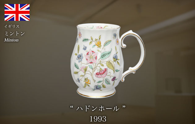 1793年、彫刻師のトーマス・ミントンによって創立。彼がこだわった「高い芸術性」はやがて、豪華に金を盛り上げていく装飾の技法やエッチング、絵画を思わせる絵付けで花開き、優雅で香り高い器を次々に発表していきます。それは、ヴィクトリア女王にも「世界で最も美しいボーンチャイナ」と絶賛され、現在でも各国王室で広く愛用されています。