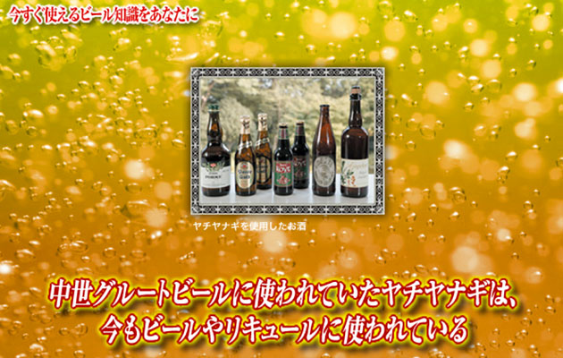 学名:Myrica gale。ヤマモモ科の落葉小低木、温帯地域の湿地に多く自生し、雌雄で株が異なるのも特徴。谷地(ヤチ)は湿地帯を意味し、その姿が柳に似ているため、ヤチヤナギと呼ばれています。スコットランドや北欧、ドイツ北部の湿地帯に自生。すがすがしい独特の香りを持ち、中世当時は比較的手に入りやすいハーブの一種だったようです。ヤチヤナギの自生地とグルートビールの普及地はほぼ重なっていて、現在でも、デンマークやオランダなどでは、ヤチヤナギを使用した特別なビールがつくられているといいます。