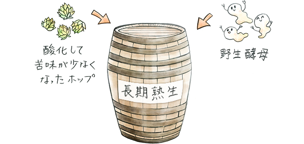 ランビックは、大麦の麦芽だけでなく発芽させていない小麦を使用し、殺菌力が強いホップを大量に加えます。ランビックにとってのホップは、香りづけを意図したものではなく、長期間の熟成に耐えられる防腐剤として必要とされています。あえて、摘んでから1年以上が経ち、酸化して苦みが少なくなったホップを用いますが、これにより独特の強い酸味とチーズのような香りが生まれます。