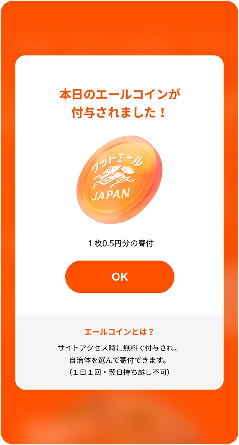 1日1回誰でも寄付エールコイン1枚で0.5円の寄付になります。/