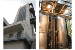 - 35メートルもの高さがある連続式蒸留機で2回蒸留。ここで、原料のアルコールに磨きをかけ、雑味を取り除きます。