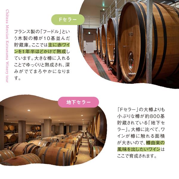 「Fセラー」はフランス製の「フードル」という木製の樽が10基並んだ貯蔵庫。ここでは主に赤ワインを1年半ほどかけて熟成しています。大きな樽に入れることでゆっくりと熟成され、深みがでてまろやかになります。
