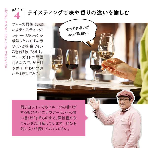 ツアーの最後はいよいよテイスティング!シャトー・メルシャンが厳選したおすすめ赤ワイン2種・白ワイン2種を試飲できます。ツアーガイドの解説付きなので、見た目や香り、味わいの違