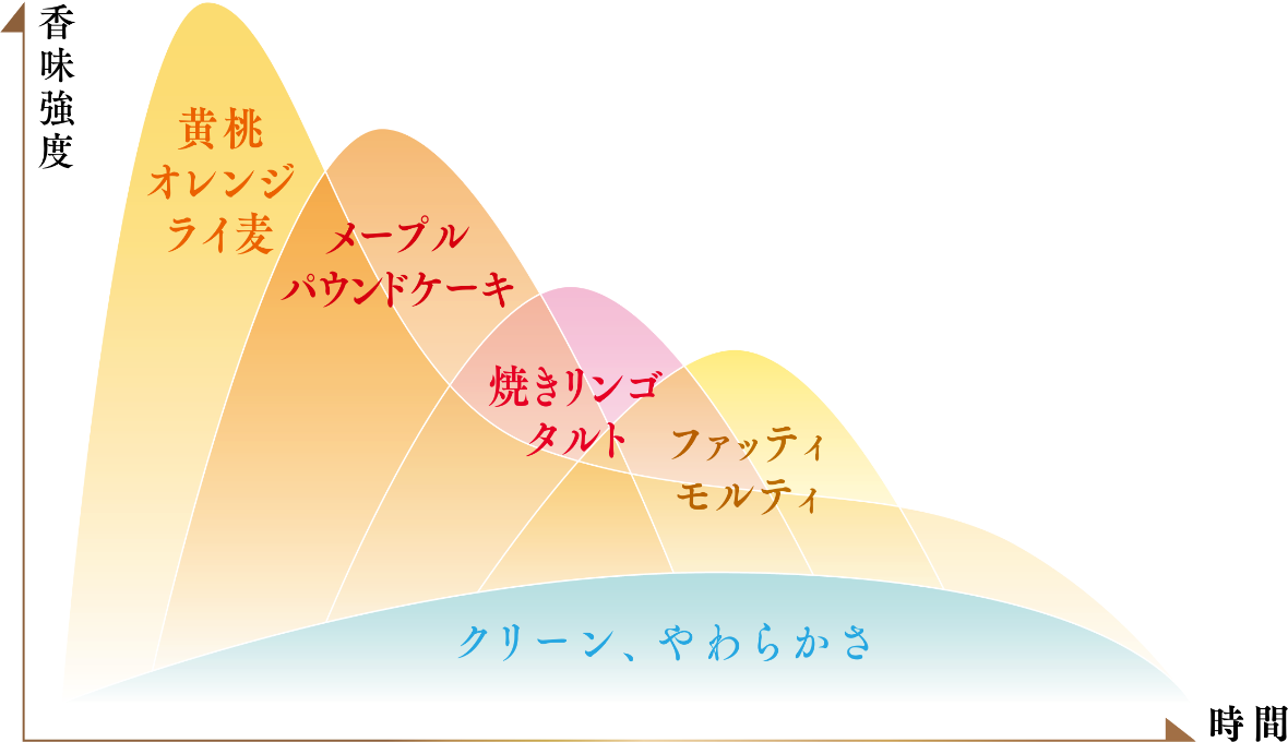 フルーティーな黄桃を連想させる香りに、メープルシロップのような甘い香り。