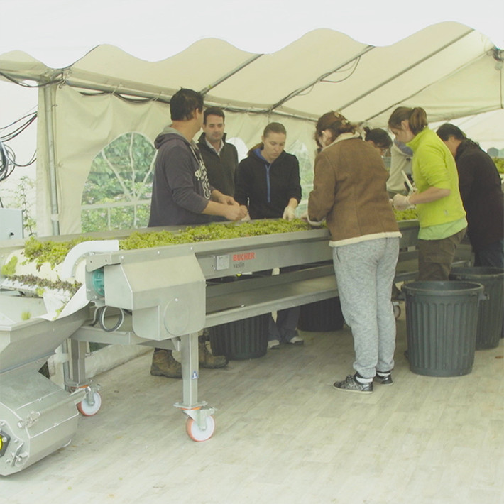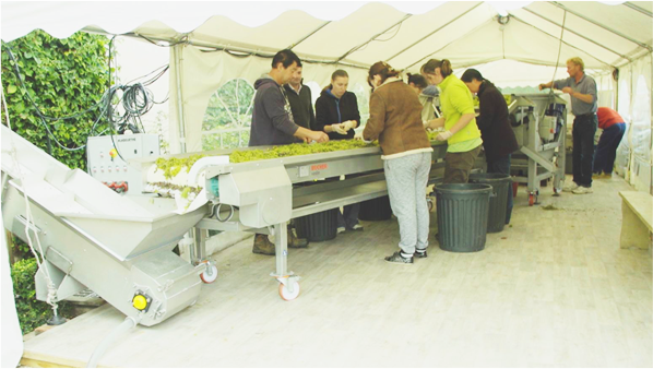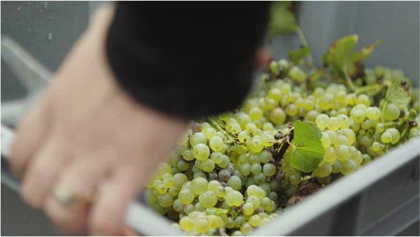 収穫されたシャルドネは、すぐに選果され、 房ごと圧搾されます