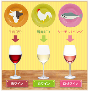 赤ワインなら、たとえば赤身の牛肉、白ワインなら白身の鶏肉やお魚、ロゼワインならピンク色のサーモンといった具合に、同じ色の素材を持ってくるだけで、ワインと普段の家庭料理がすんなり合います。