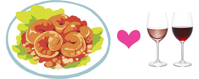 食材や料理の色合いはもちろん、海老の持つ旨み、トマトの酸味、ピリ辛の味付け… そのすべてがロゼワインと好相性。軽めの赤ワインでもOKです。