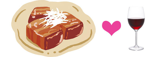 濃厚な味付けで食べ応えのある豚の角煮には、その味わいに負けない赤ワインがおすすめ。丁子(クローブ)をきかせたものなら、黒コショウなどスパイスのニュアンスを持つ赤ワインが好相性!