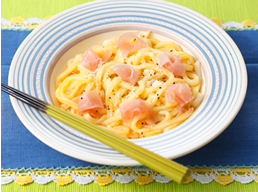 冷凍うどんを解凍し、溶きほぐした生卵、粉チーズ、ハーブソルト(なければ塩)で和えるだけ! 生ハムを丸めて、可愛らしくのせると気持ちも上がります♪