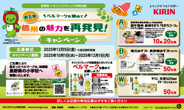 ベルマークを集めて信州の魅力を再発見!キャンペーン ~今年も開催!ベルマークを集めて豪華賞品をゲットしよう!~ 25年10月1日(水)~12月1日(月)まで「ベルマークを集めて信州の魅力を再発見!キャンペーン」を実施します。キリンビバレッジの対象商品についているベルマークを集めて応募すると、長野県が誇る美味しいもののお店、JA全農直営店の和牛焼肉 信州そだちにて「そだちコース」をペアでご招待などの豪華賞品が当たるチャンス!集まったベルマークは抽選後、長野県内の小学校へ贈られます。奮ってご応募ください。詳しくは店頭の専用応募はがきをご覧ください。