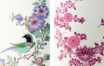 ヘロルトの天才的な絵付けの技術はマイセンにおいても際立ち、「シノワズリ(中国趣味)」をモチーフとした絢爛かつ精密な筆致は、最大のパトロンである選帝侯アウグスト強王を大いに魅了します。ヘロルトの絵付けがされた磁器は、当時としては柿右衛門様式に次ぐ高価な商品となりましたが、それでも各国の王侯貴族から大量に注文が舞い込み、マイセンは名実ともに本場東洋の磁器と肩を並べることになりました。またヘロルトの作風に合わせるように絵具も進化をとげ、その多彩な色味の調合法は、今も変わることなく受け継がれています。
