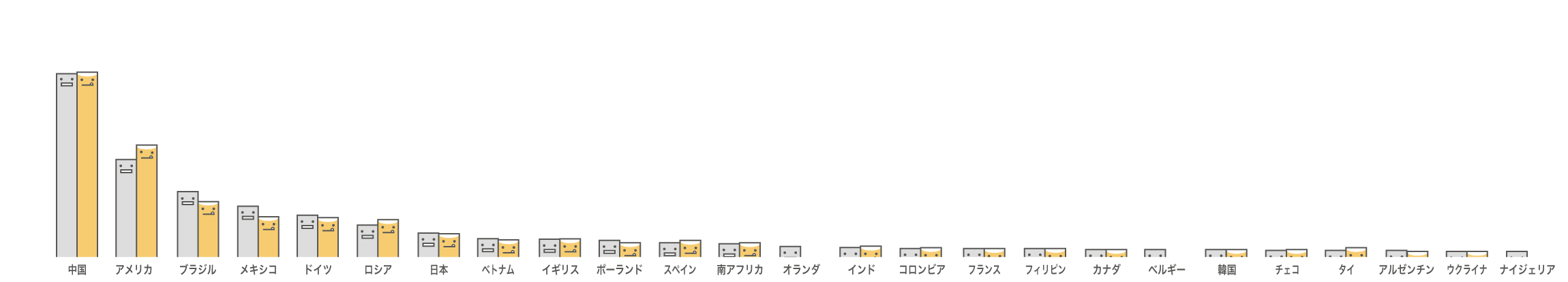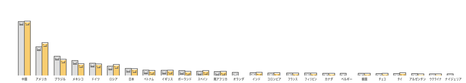 国別では、中国(前年比2.2%減)が17年連続でトップ、アメリカ(前年比1.7%減)、ブラジル(前年比1.0%増)と続く。日本(前年比2.7%減)は昨年同様の7位だった。