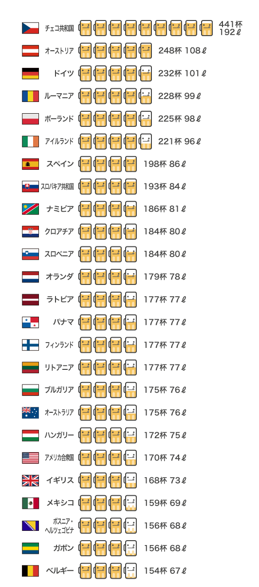 チェコ共和国は26年連続で1位となった。上位35カ国のうち、昨年より消費量の伸びた国は21カ国。日本は40.2L、大びん換算で約63.4本(前年比0.1本減)という結果であった。