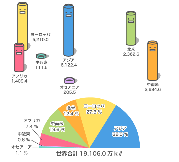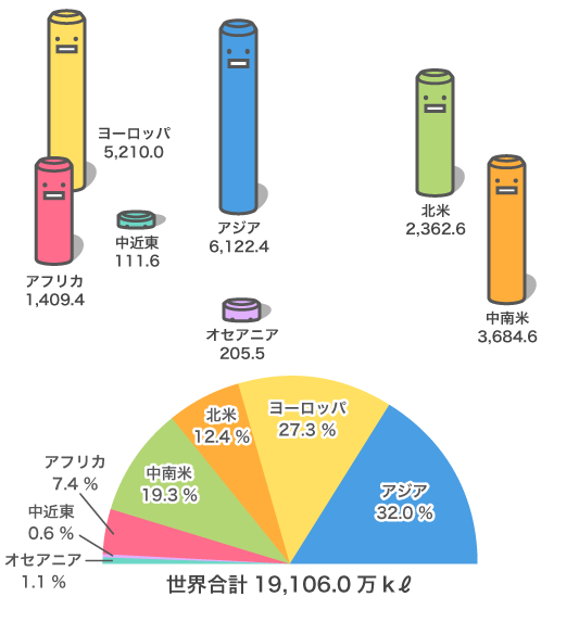 世界の総消費量は、約1億8,879万kl(前年比0.8%増)で、4年ぶりにプラス。東京ドームをジョッキに見立てると、約152杯分に相当する。