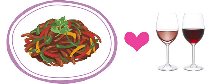 豆板醤、甜麺醤(テンメンジャン)、オイスターソースで味付けされた濃厚な味わいの青椒肉絲には、濃いピンクのロゼワインや赤ワインがぴったり。