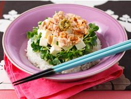 ごはんの上に角切りのクリームチーズ、ノンオイルのツナ、貝割れ大根(お好みで)をのせたら、醤油、オリーブオイルを数滴たらし、ゆずこしょうを添えるだけ。食感もよく、白ワインにぴったりの爽やかな丼です♪