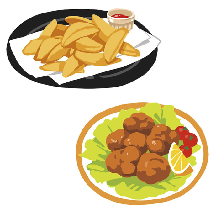 鶏の唐揚げ、タコの唐揚げ、ゴボウの唐揚げ、ポテトフライ、チーズフライ、串揚げといった揚げ物なら、スパークリングワイン、白ワイン、ロゼワイン、赤ワインまで種類を問わずお好みで楽しめます。アツアツの揚げ物には氷を入れたロックワインもおすすめ