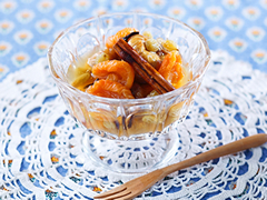 - 耐熱皿にドライフルーツ(いちじく、アプリコット、グリーンレーズン)、シナモンスティック、クローブを合わせ甘口ワイン、砂糖を加える。