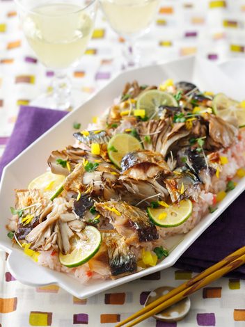 秋刀魚の切り身を2cm幅に切り、舞茸と一緒にグリルで焼きます。酢飯に紅ショウガと白ごまを混ぜ、秋刀魚と舞茸をのせたら、スダチ、菊花、たくあん、スプラウトを彩りよく散らして完成です。