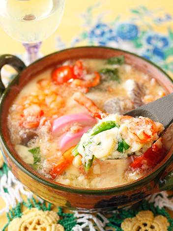 大きめの鉢に鯛の切り身、えび、しめじ、かまぼこ、ミニトマト、小松菜を入れ、茶碗蒸しをつくります。次にカニ、白ワイン、鶏がらスープ、醤油、みりんでつくったあんを茶碗蒸しにかけて完成です。冷やしてもおいしくいただけます。