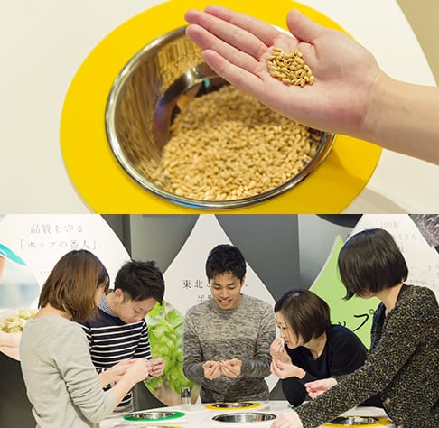 大麦畑やホップ畑の視覚や聴覚に訴える動画を見ながら、麦芽の試食やホップの香りを体験できます。