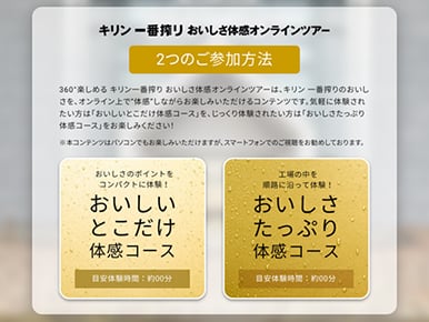 オンライン工場見学「360°楽しめる。キリン一番搾り おいしさ体感オンラインツアー」は、スマートフォンやパソコンなどから気軽に参加でき、工場見学ガイドによる案内を受けながら、お客様自身で3D空間を自由に操作することができる体感型のオンラインコンテンツです。