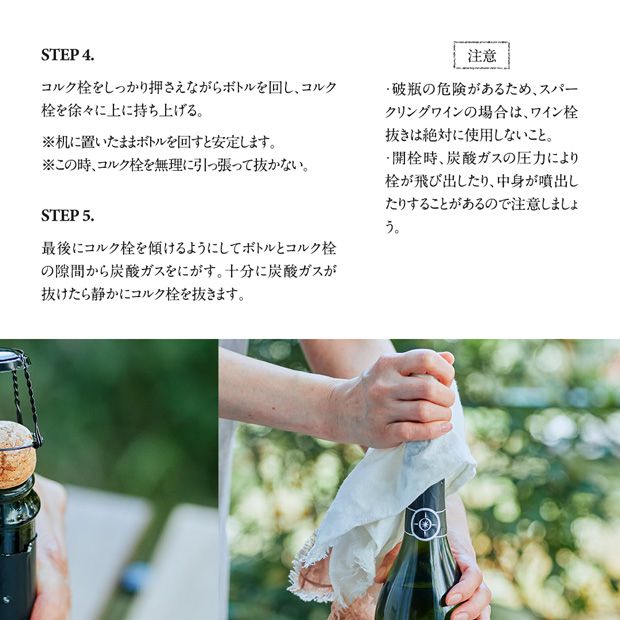 ・破瓶の危険があるため、スパークリングワインの場合は、ワイン栓抜きは絶対に使用しないこと。