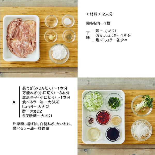 - 片栗粉、揚げ油、白髪ねぎ、かいわれ、食べるラー油・・・各適量